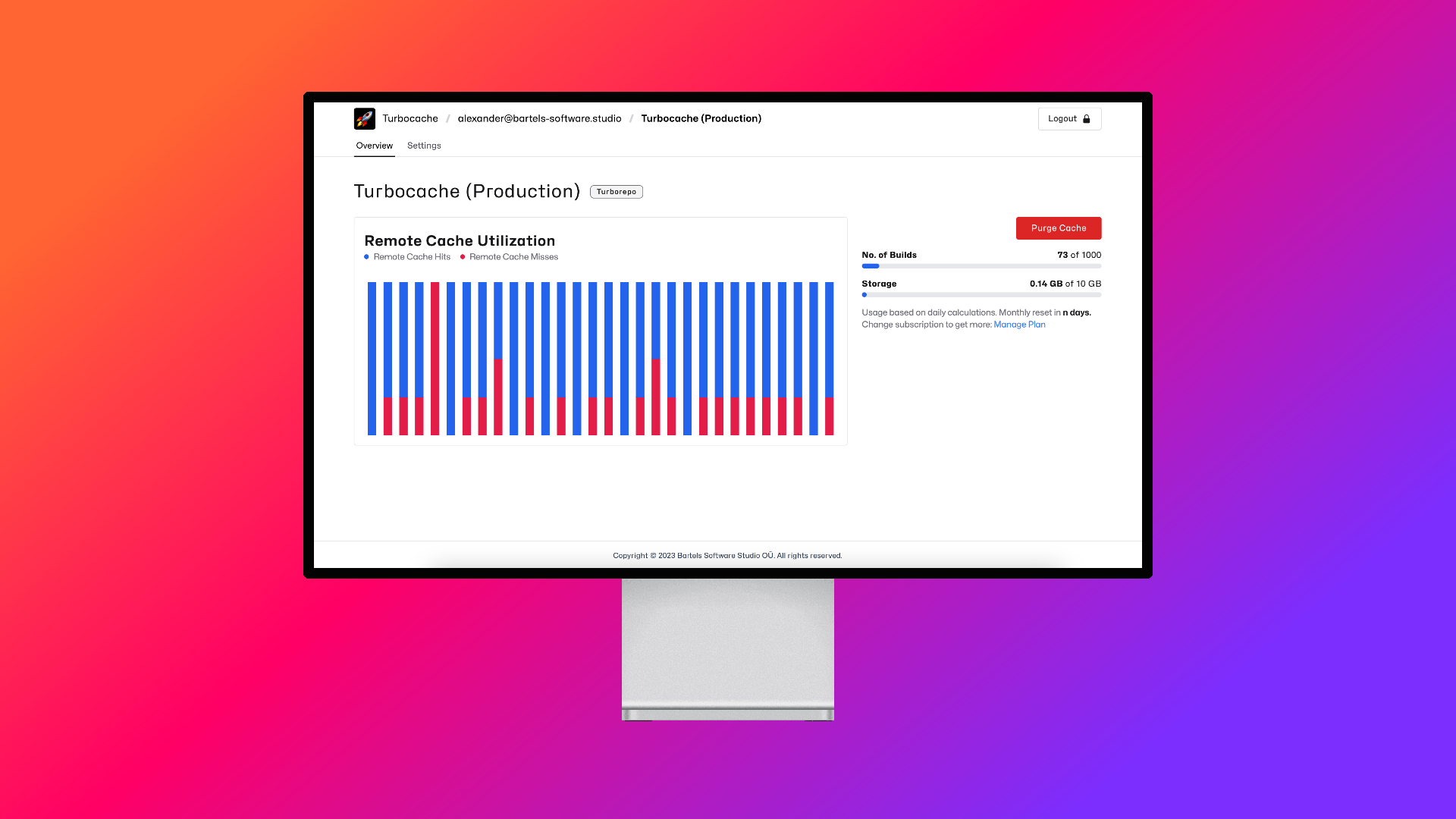 If you experience issues or reach the storage limits of your plan, you can free up space in your remote cache by purging it. To do this, simply click on the red 'Purge Cache' button located on the Remote Cache Overview page. Please note that purging the cache will permanently delete all cache artifacts, so use this option with caution.